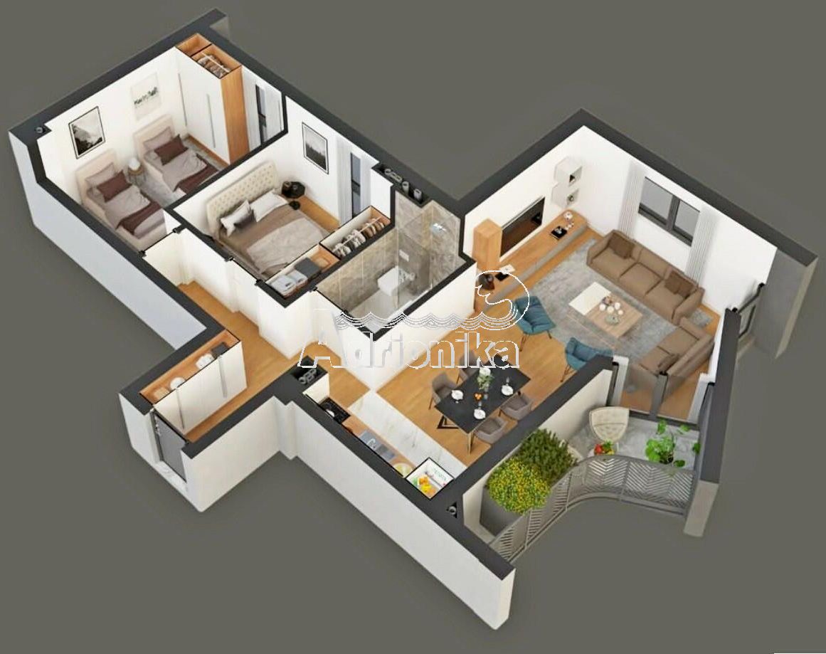 Продаётся новая современная трёхкомнатная квартира площадью 64 м?, с двумя спальнями и гостиной, расположенная в новом жилом доме в центре города Бар, всего в нескольких шагах от моря.