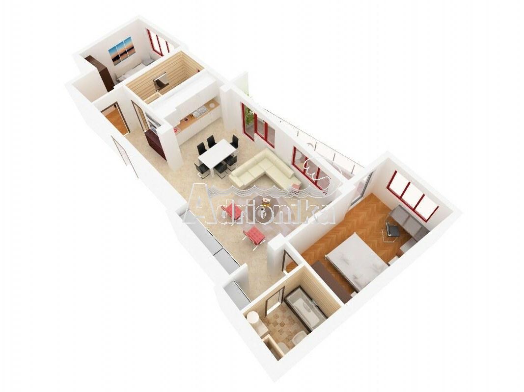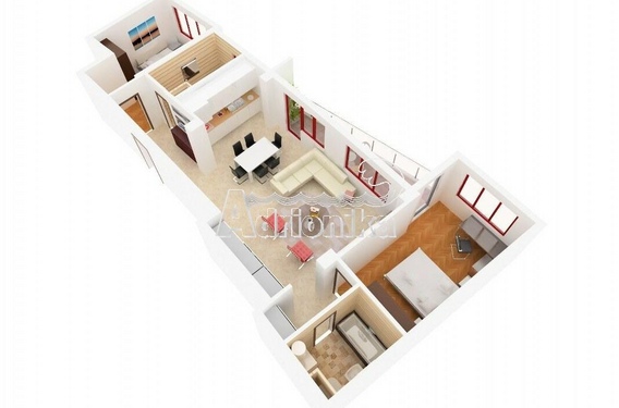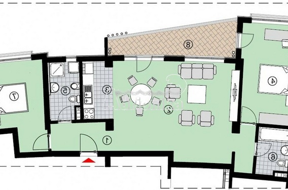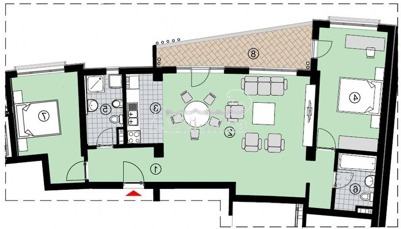 Структура квартиры: просторная гостиная с кухонной зоной, две спальни, два санузла с ванной и терраса. На всех окнах установлены роль-ставни.