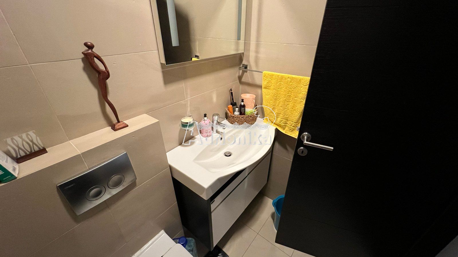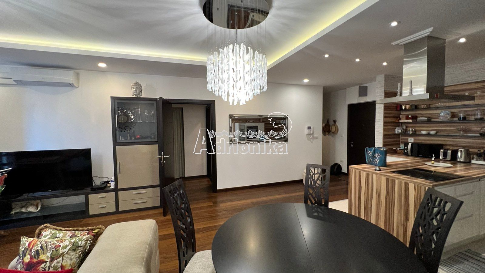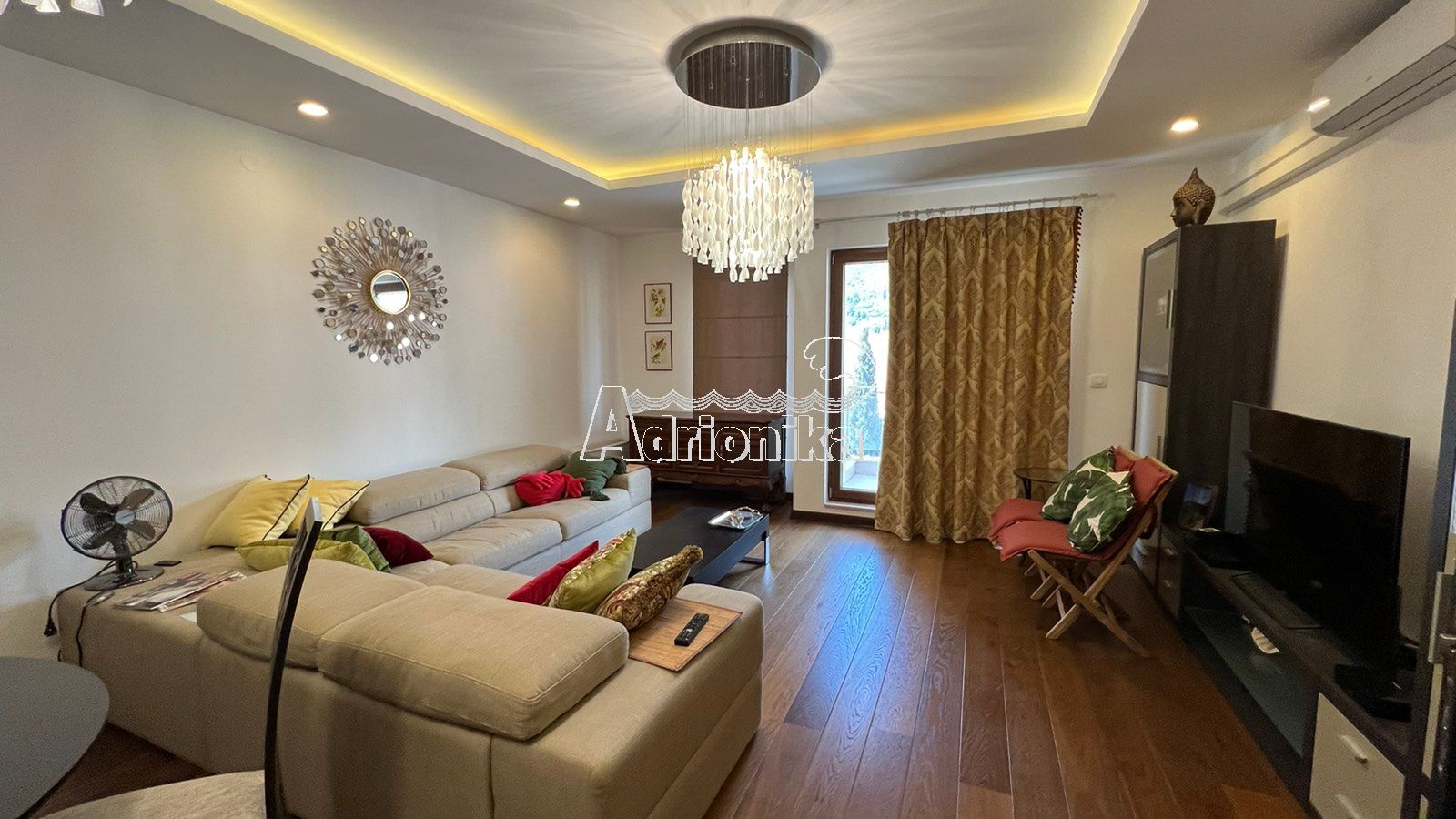 Продается квартира в Будве. Квартира имеет площадь 77 м2 и расположена на 3 этаже. Планировка квартиры: кухня, совмещённая с гостиной, одна спальная комната, ванная комната, гостевой туалет и терраса с видом. Квартира не только полностью меблирована, но и оснащена всей необходимой техникой. Все комнаты оборудованы кондиционерами. Под домом расположена закрытая парковка. В шаговой доступности от квартиры находятся магазины, кафе, почта, остановка, а расстояние до моря составляет всего 440 метров.