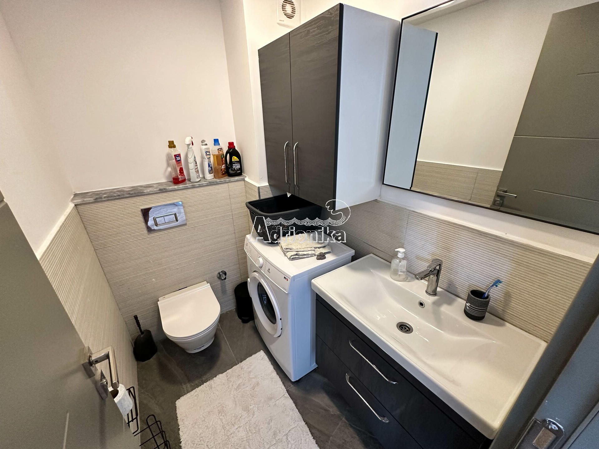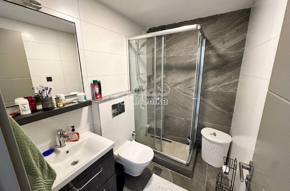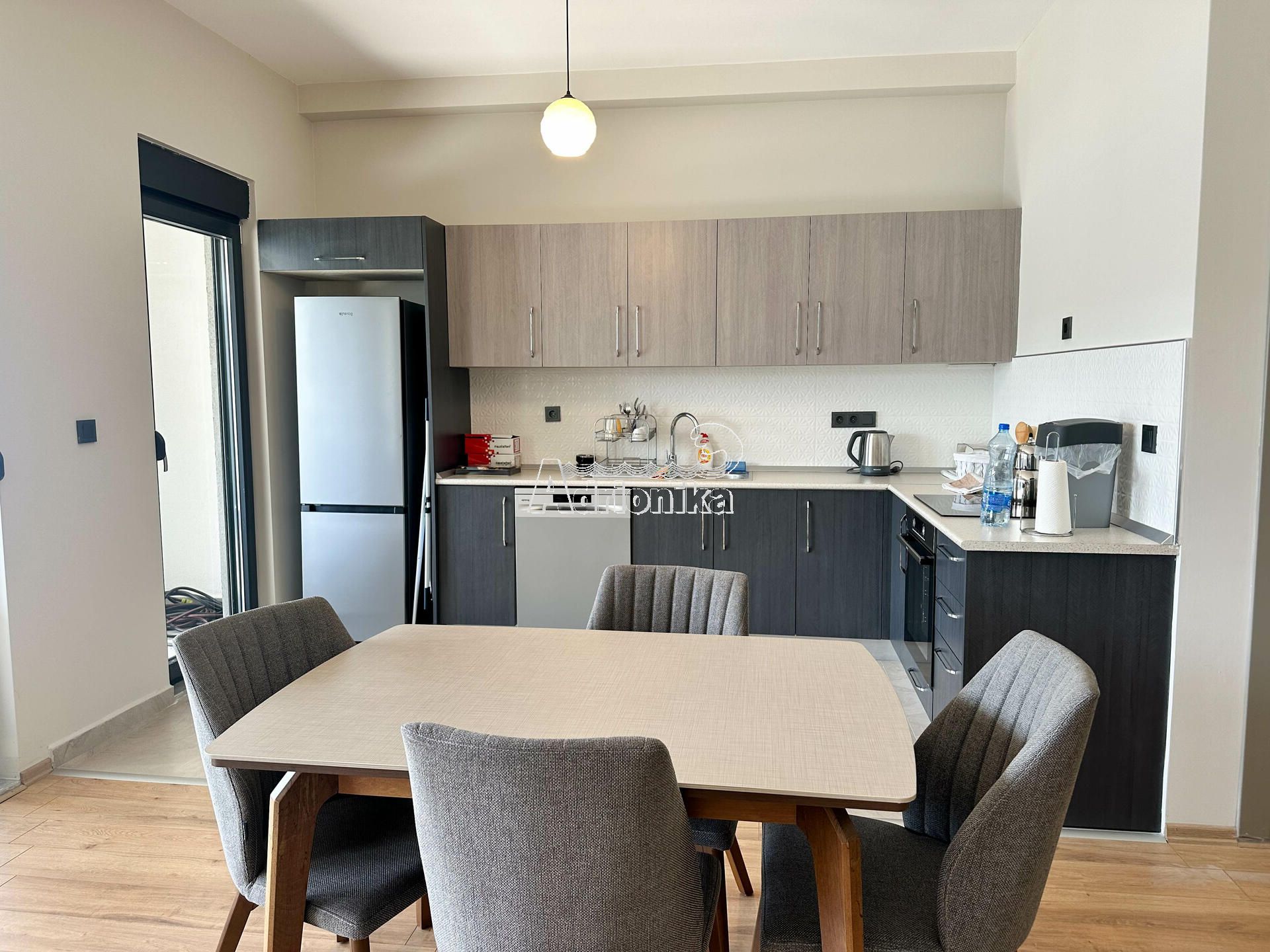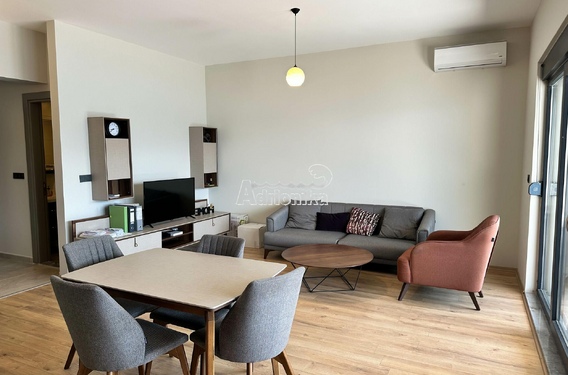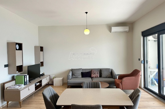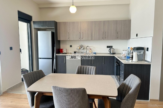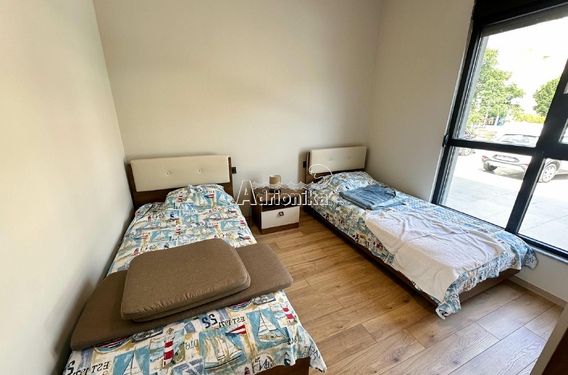Квартира расположена на третьем этаже новостройки. Площадь квартиры 94м2. Состоит из прихожей, двух спален, ванной комнаты, туалета, открытой гостиной с кухней и столовой, а также большой террасы с прекрасным видом на море.