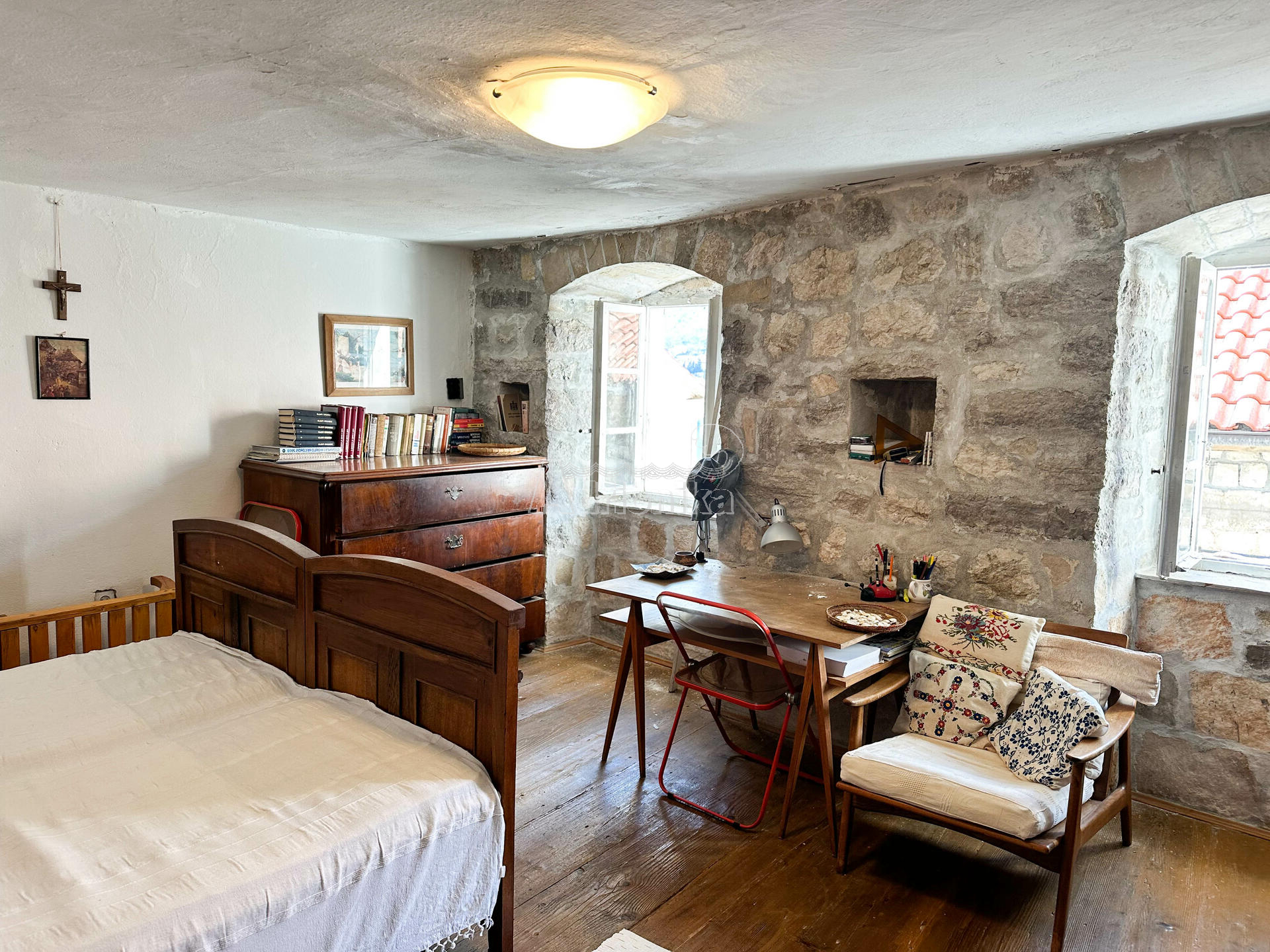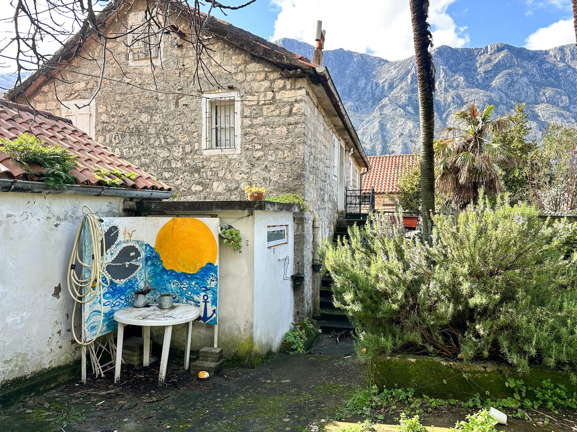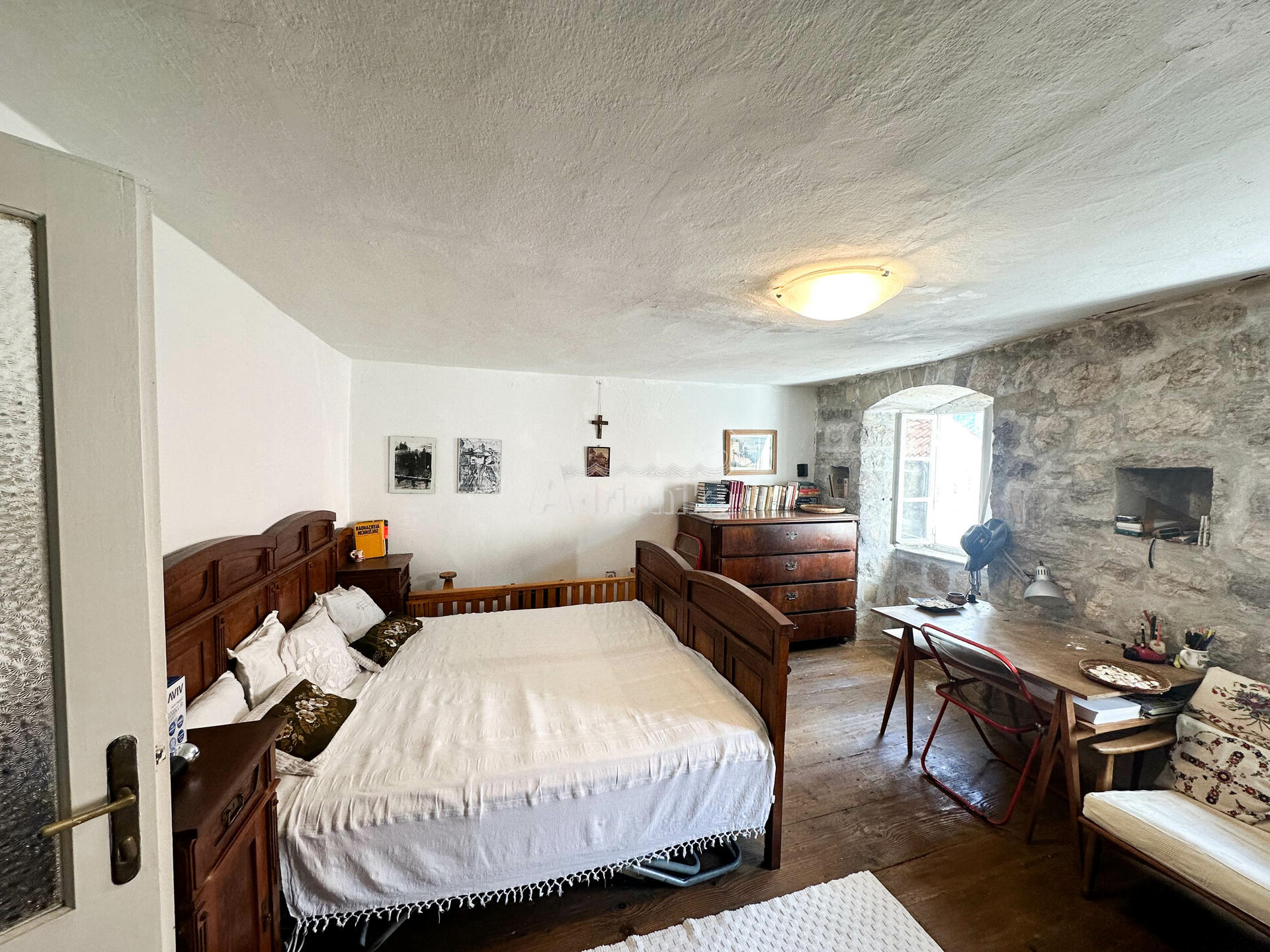 Квартира расположена на третьем этаже каменного дома. Имеет отдельный вход во двор, откуда в квартиру ведет лестница. Квартира площадью 55м2 состоит из гостиной, двух спален, небольшой кухни и туалета. Двор имеет площадь 145м2, где также есть вспомогательная постройка 23м2, которая используется как летняя кухня. Ее можно переоборудовать в квартиру-студию или что то подобное.
