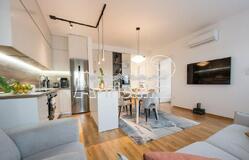 Квартира состоит из открытой гостиной со столовой и кухней, двух спален и ванной комнаты.