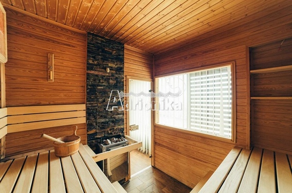 Сауна представляет собой отдельное здание возле бассейна. В нём есть зона отдыха, ванная комната и парилка. Сауна электрическая, имеет печь с автоиспарителем, который автоматически поддерживает заданную влажность и температуру. Внутри парилки установлены пластины с гималайской солью. Массажное кресло в предбаннике дает дополнительную возможность для расслабления и восстановления.