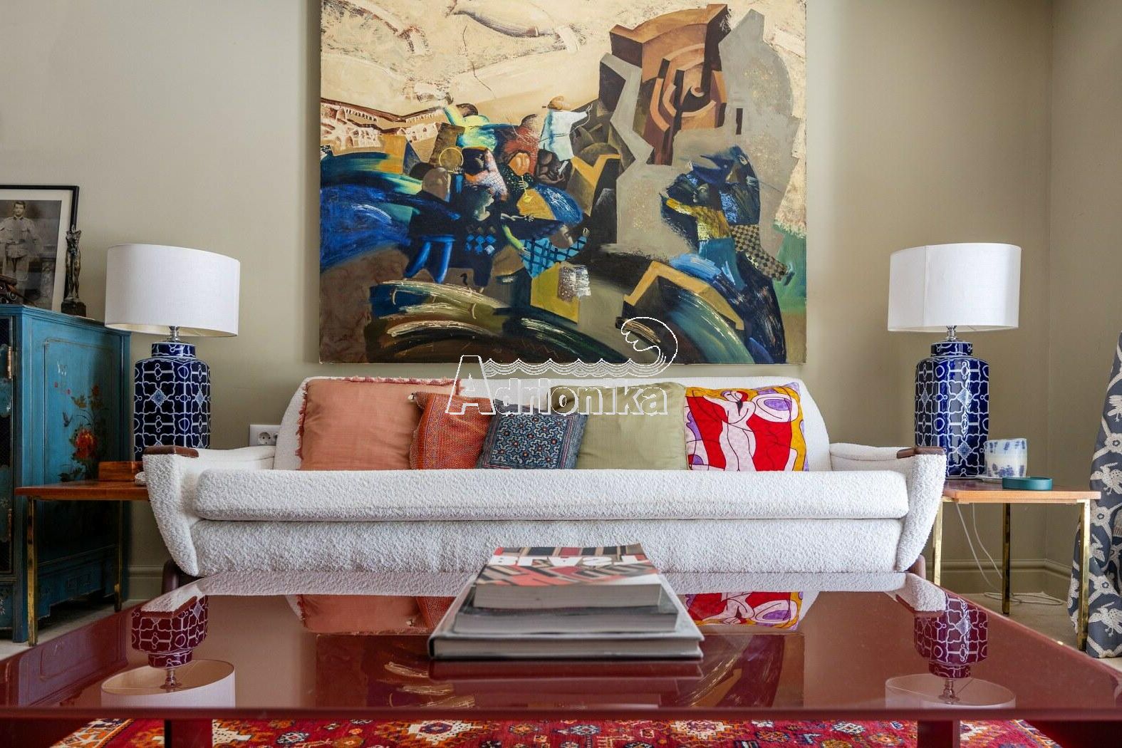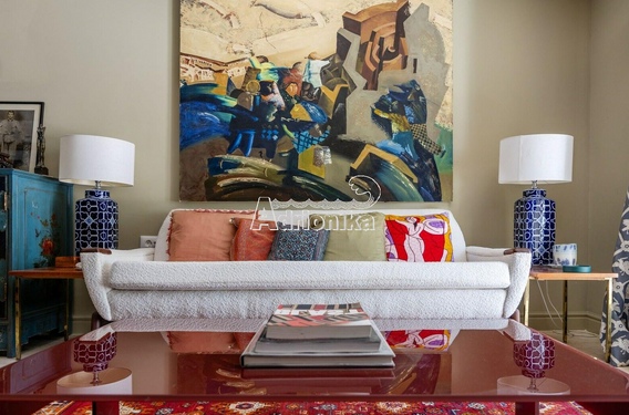 Гостиная: открытая планировка — гостиная, кухня и столовая с выходом на террасу через французские двери