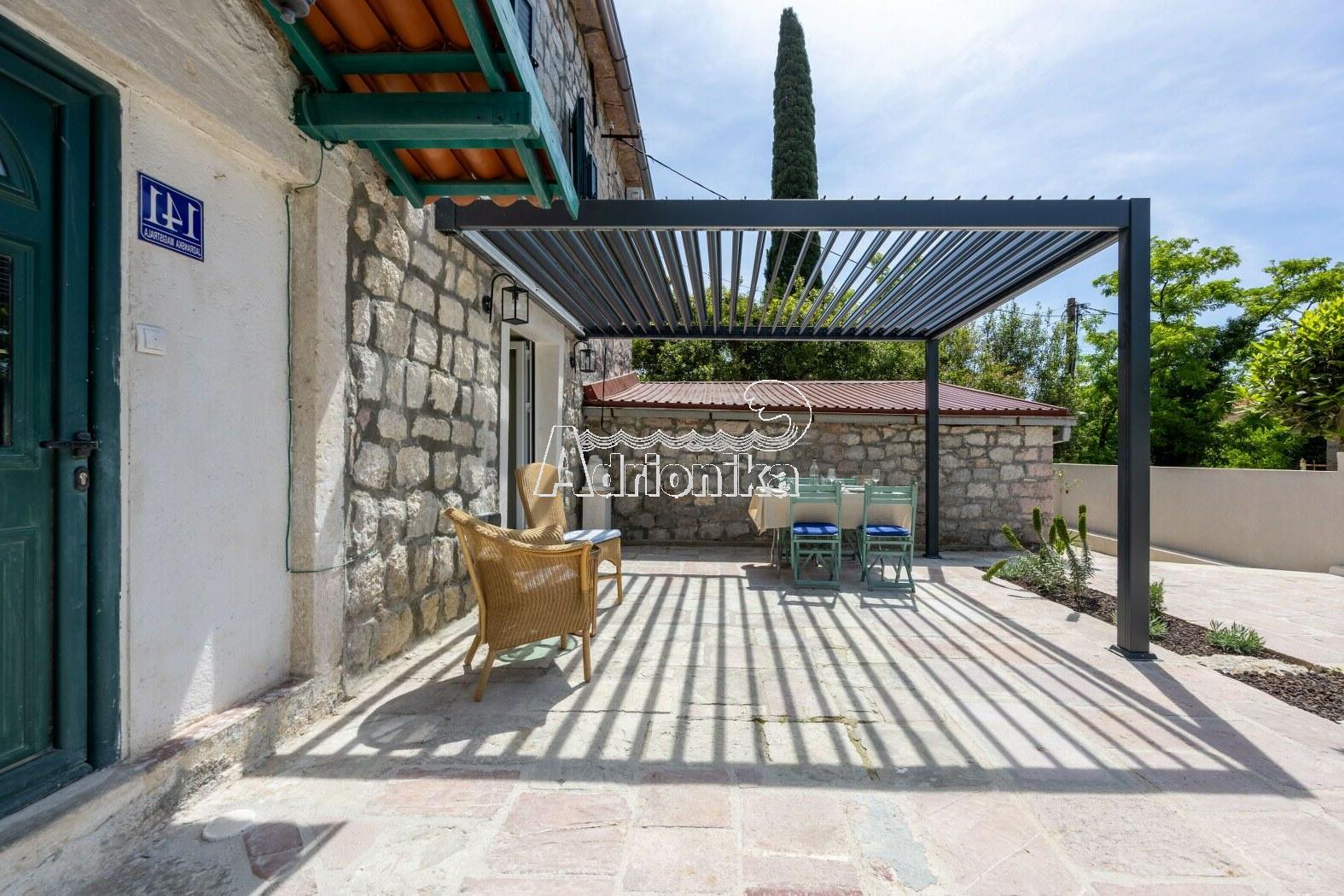 Терраса: 71 м?, каменная, с современной алюминиевой перголой и регулируемой крышей