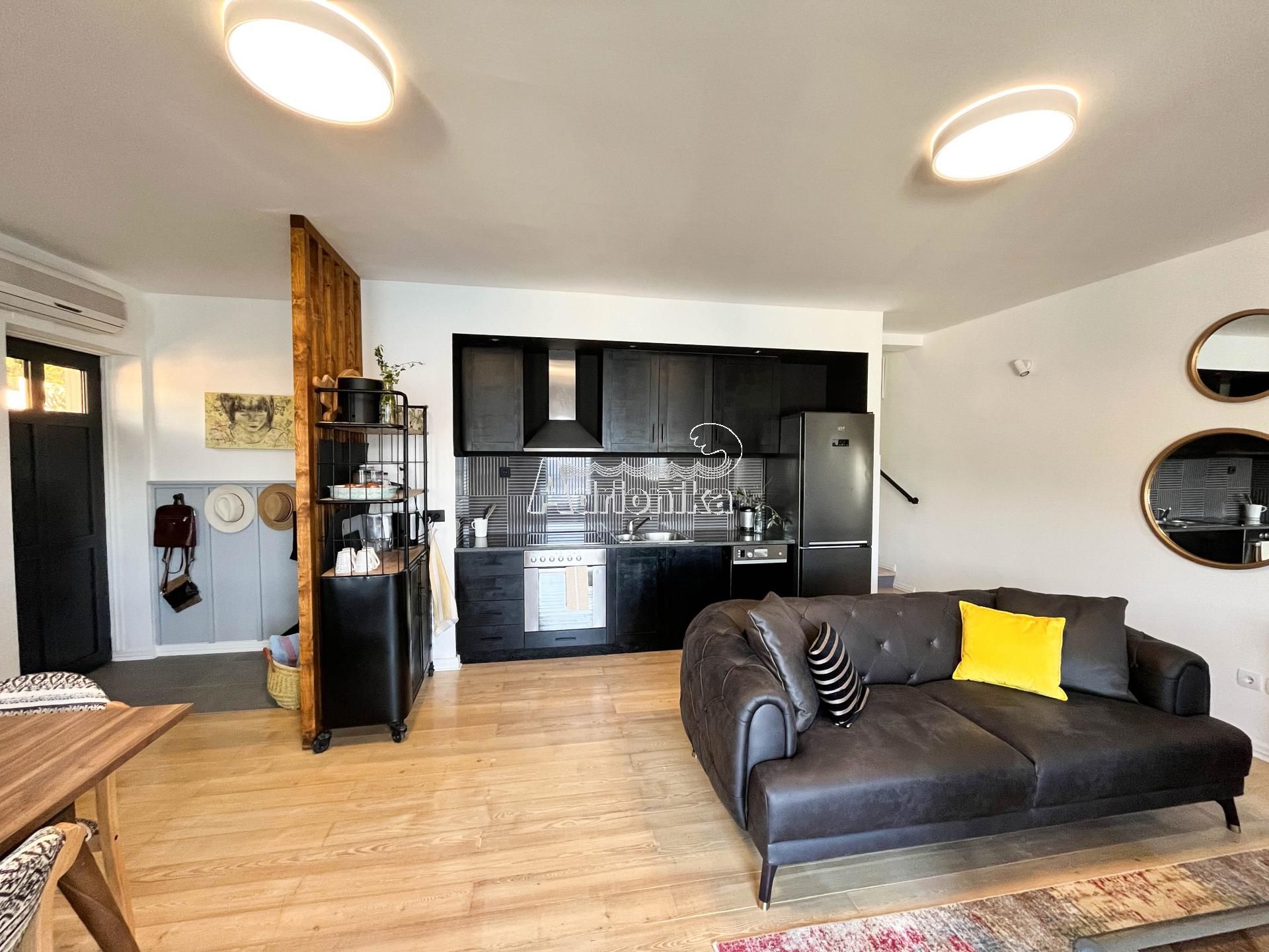 Этот дом расположен на первой линии моря, над дорогой. Дом поделен на две части и продается только одна его часть.