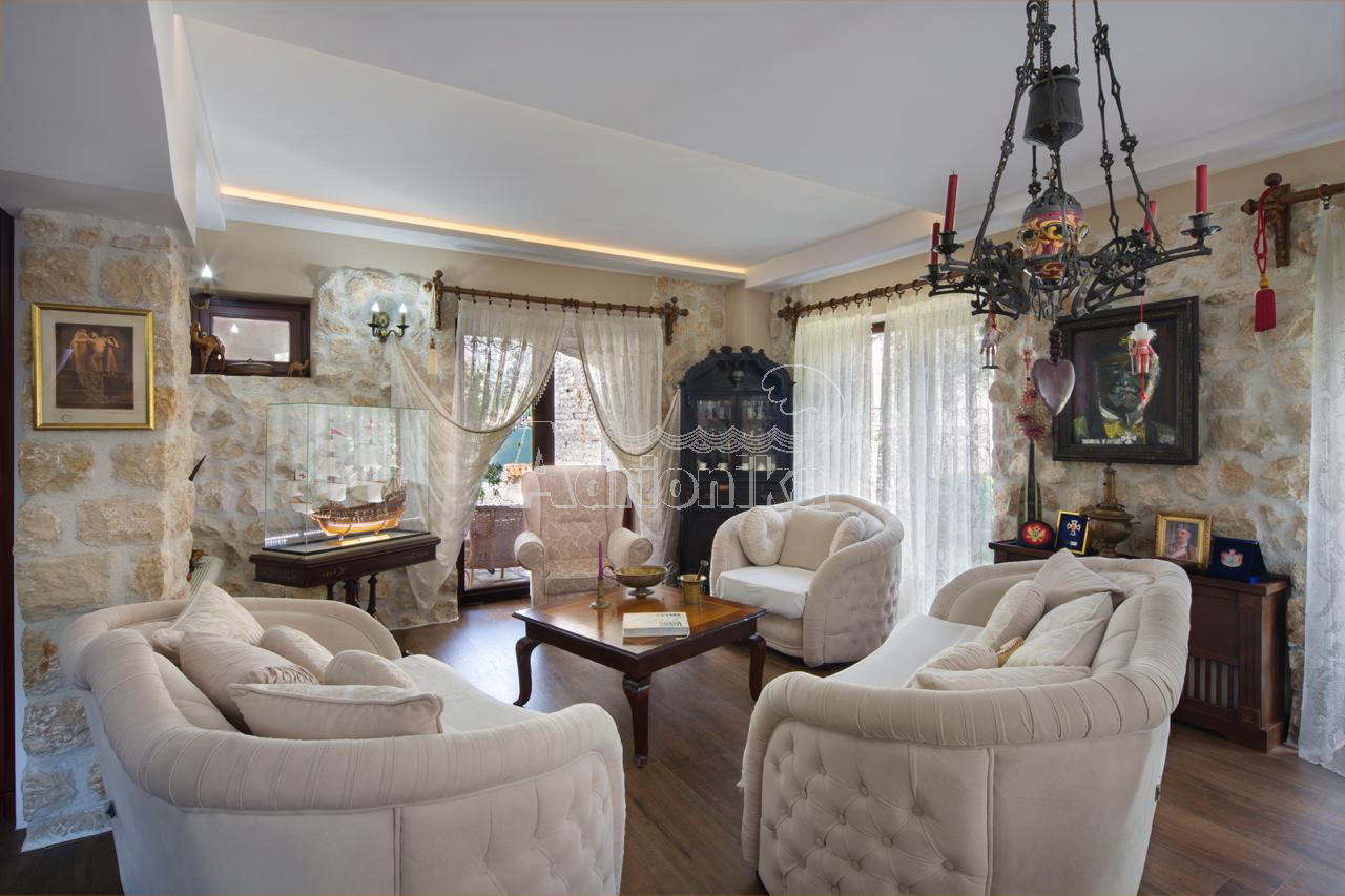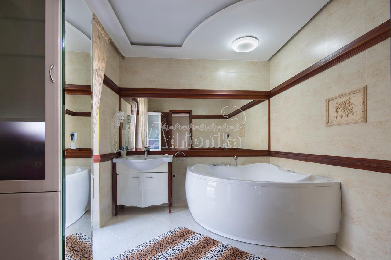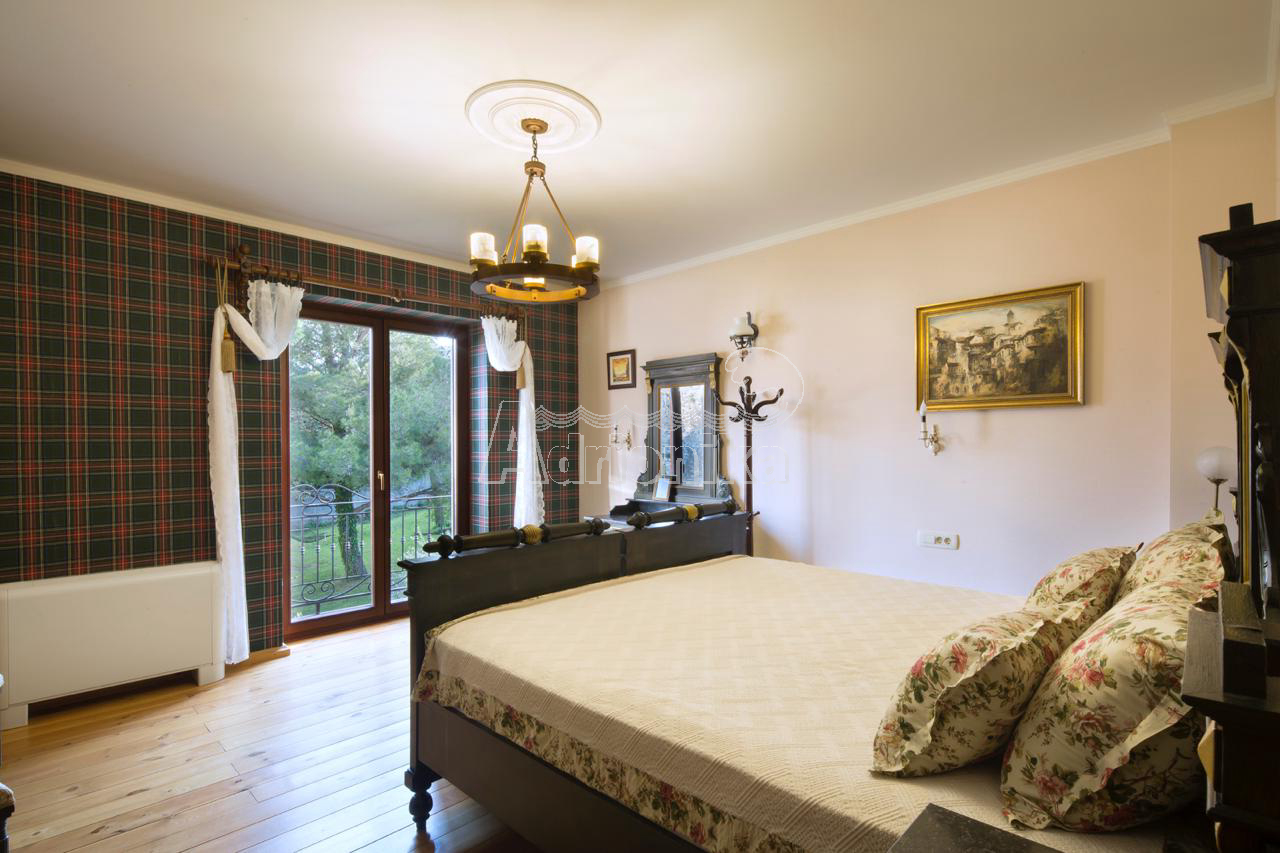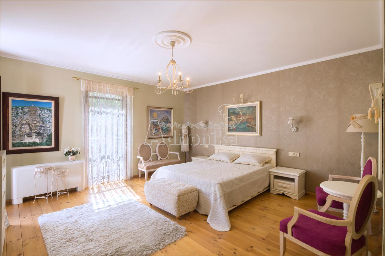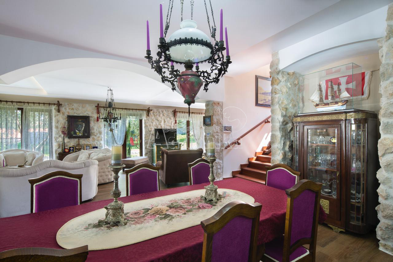 Продается вилла, которая расположена на участке площадью 910 м2. Площадь виллы 497 м2 + терраса. Есть 4 парковочных места. Дом состоит из подвала, цокольного этажа, первого этажа и второго этажа. В подвале есть сауна на 6 человек и помещение для винного погреба. На цокольном этаже столовая, кухня, гостиная, тренажерный зал и ванная комната. На первом этаже четыре спальни, каждая с ванной комнатой, две большие террасы - одна с видом на море, а другая у бассейна. На втором этаже гостиная с ТВ-залом, библиотекой, бильярдом и местом для игры в карты, а также ванная комната и гардеробная. В доме есть техническое помещение, содержащее насосы для бассейна, устройства для наблюдения, оборудование для подогрева и охлаждения. На первом этаже, а также во всех ванных комнатах пол с подогревом. В доме есть летняя кухня и бассейн 11 x 3 м, с дополнительной электрической подачей воды через тепловой насос. В доме антикварная мебель.