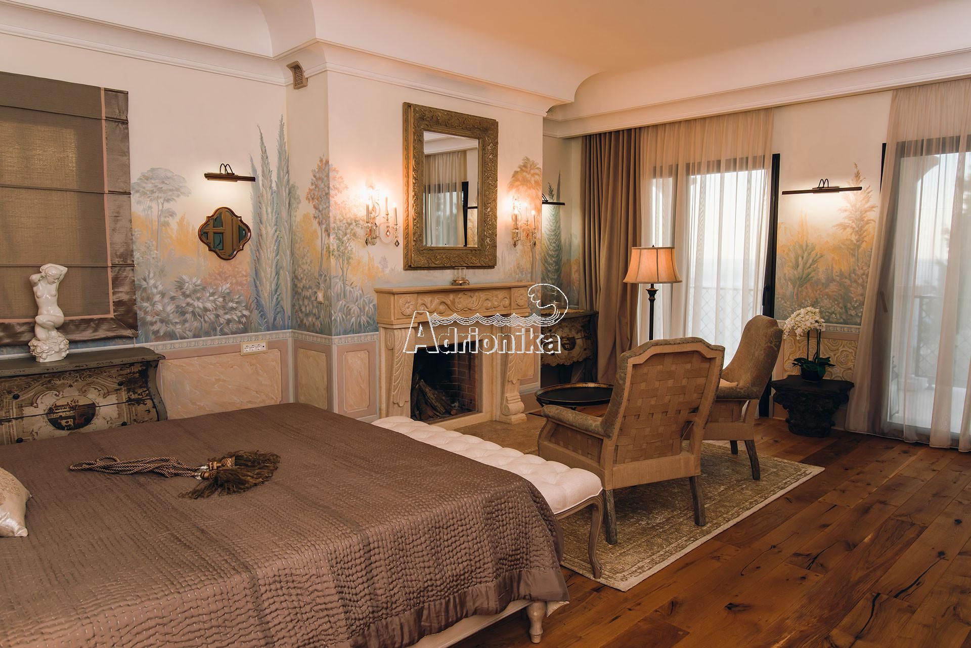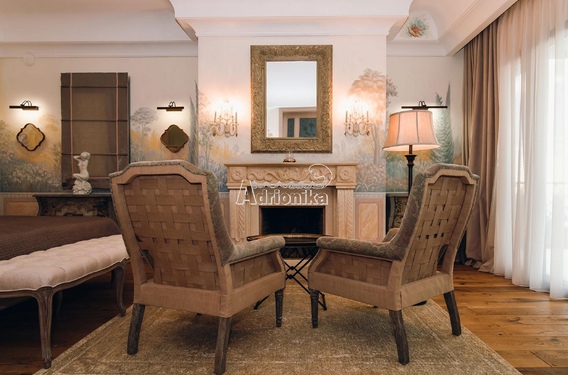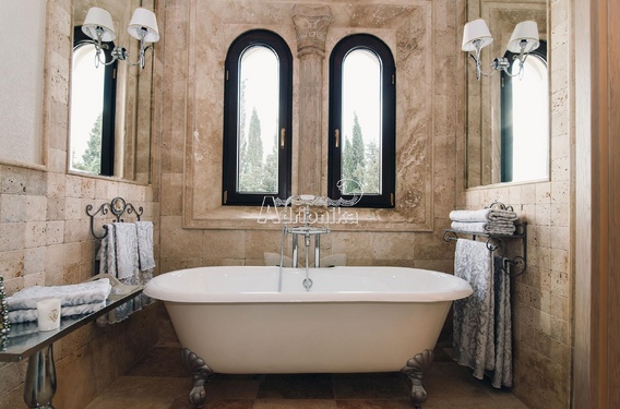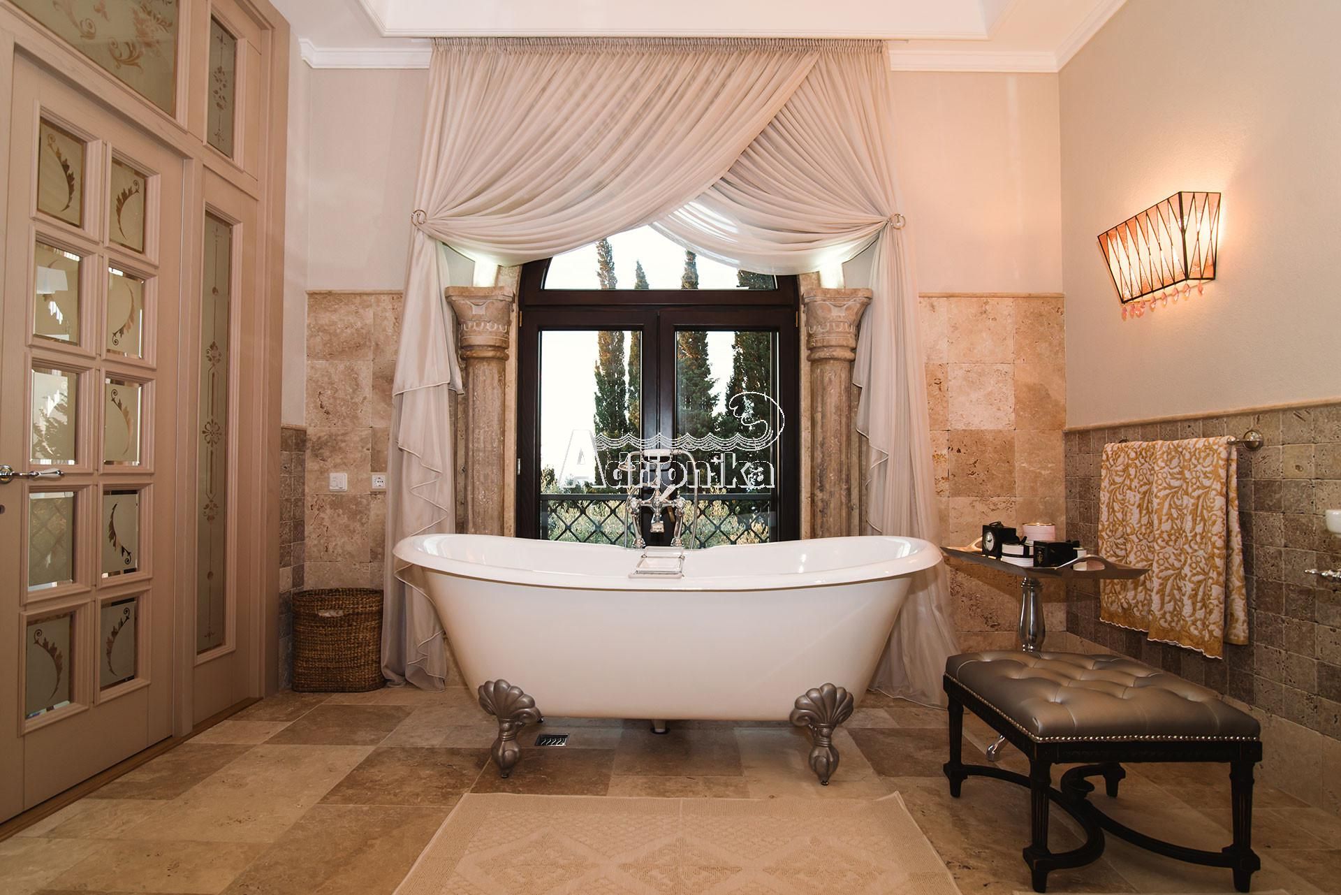 Второй этаж: - 3 спальни со своими роскошными ванными комнатами. Эта часть дома наполнена любовью и светом тут собрано множество декоративных приёмов, элементов, тут все для удобства, для жизни для удовольствия. Главная спальня, она бриллиант во всей вилле. Большая площадь спальни, с расписными стенами знаменитого художника, и уютным камином с мягкими креслами. Огромные окна в пол с выходом на террасы с видом на бесконечную морскую гладь. С террасы, на открывается вид на реликтовую рощу оливок, на соседние посёлки и кипарисы, огораживающие виллу и создающих великолепный ансамбль созданный природой, море, кипарисы, роща, бассейн во дворе. За широкими и высокими дверьми ведущими в ванную, расположена комната для релакса и наслаждения жизнью, чугунная ванна производителя Devon на львиных лапах, расположена прям на против окна, напротив устроена душевая того же производителя, шкафы, кресла, венецианское зеркало над умывальником, виражные светильники ручной работы собраны по эксклюзивным эскизам, разные милые детали интерьера в нишах над шкафом, портал из каменных колон и тонкие шторы из жоржета. Все это создаёт атмосферу роскоши и комфорта, где каждый будет чувствовать себя королём или королевой.