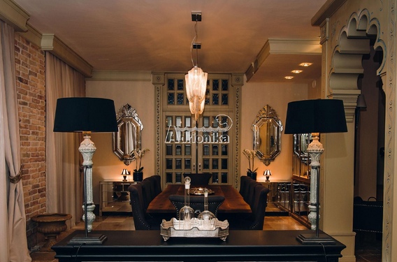 - Первый этаж: состоит из прихожей с лифтом окружённым широкой лестницей, большим шкафом для верхней одежды, зеркалами в восточном стиле и креслами. Через резную арку мы попадаем сразу в столовую - гостиную из которой в каминный зал с мягкими диванами. По другую сторону столовой можно увидеть большую раздвижную дверь украшенную витражами и хрустальными стёклами, за ней расположена кухня и туалет, а также ступеньки в цоколь и второй выход во внутренний дворик, где расположено зданием с хамам. Из всех помещений первого этажа можно выйти на террасы и в сад к бассейну.