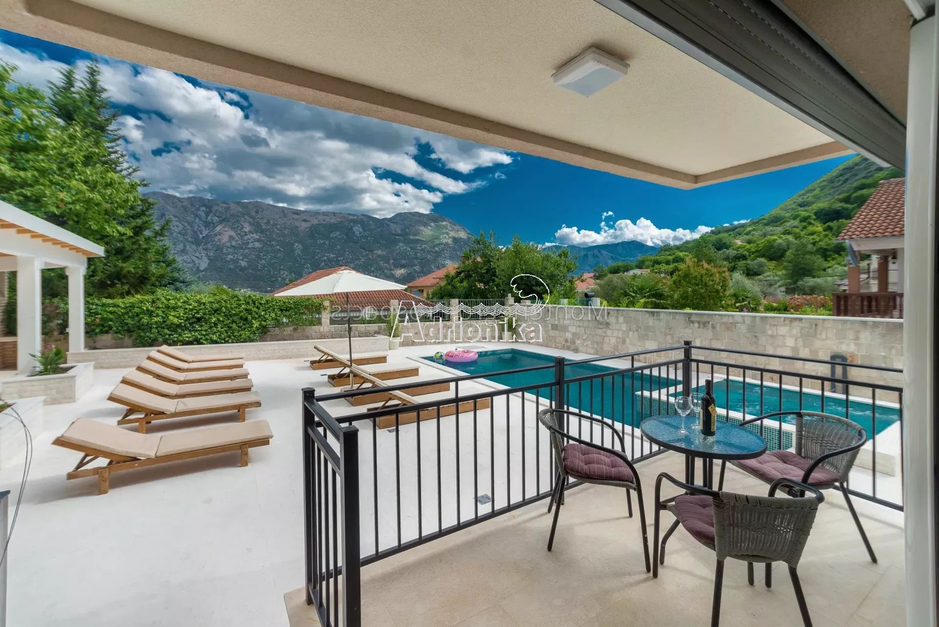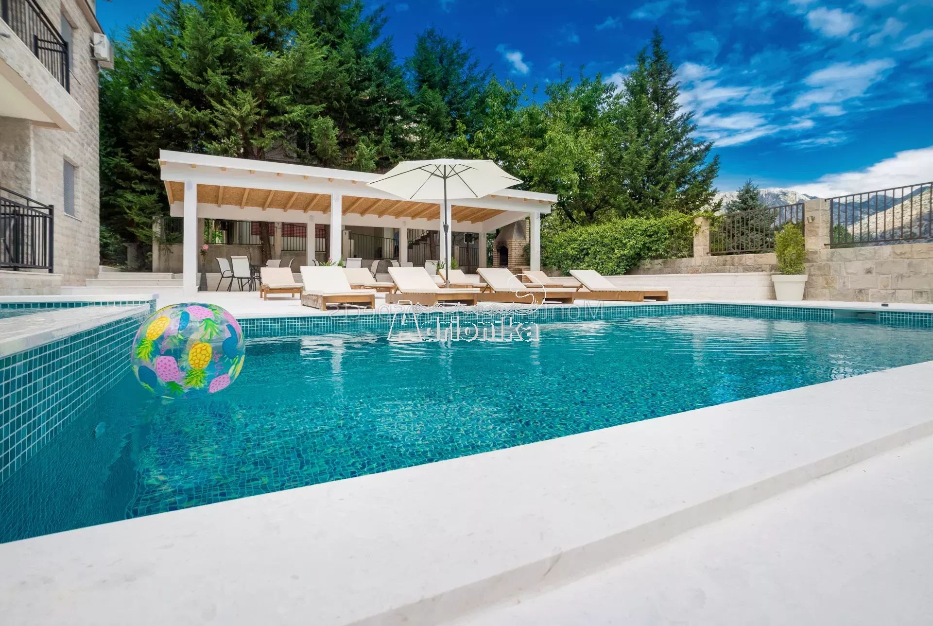 Участок имеет общую площадь 675 м2, а двор красиво благоустроен с большим бассейном, шезлонгами и беседкой.