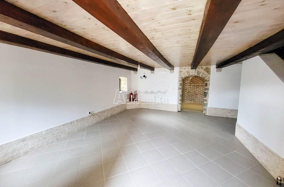 На первом этаже большая гостиная, кухня и туалет, перед домом большая мощеная терраса с местом для барбекю.